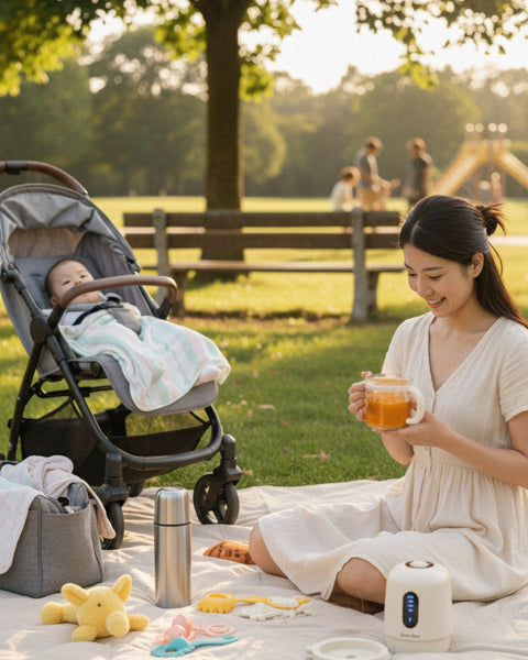Before every outing, I used to prepare the purĂ©es in advance and carry them in a thermos , such a hassle. Now I blend them on the spot. It’s fresh, quick, and baby loves it
